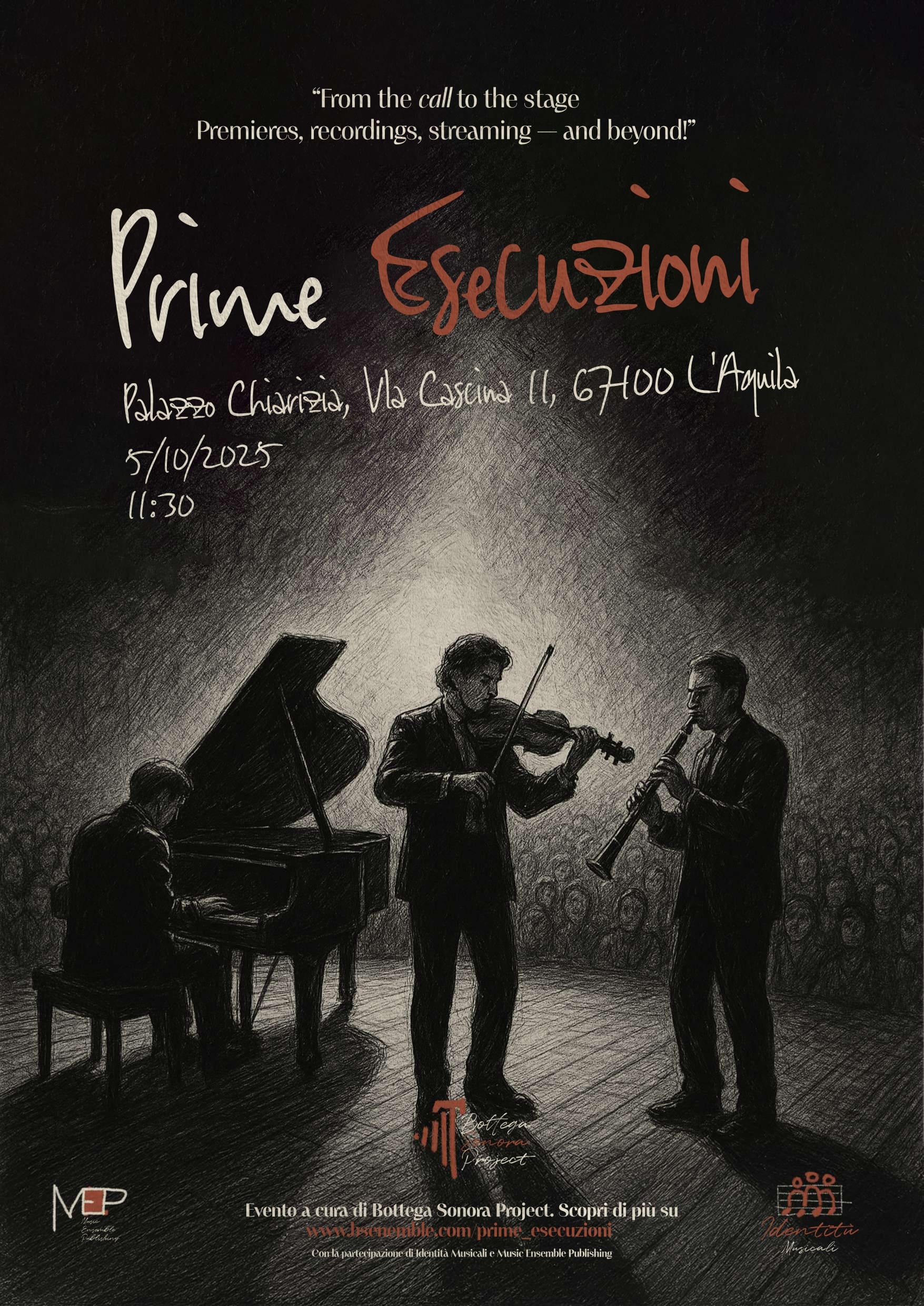 Si concluderà domenica 5 ottobre alle ore 11:30 la seconda edizione di Prime esecuzioni, organizzata da Bottega Sonora Project allo scopo di promuovere nuove partiture per clarinetto, viola e pianoforte (o loro combinazioni) e che si finalizzerà con l'esecuzione e la registrazione live dei brani finalisti. All'evento prende parte anche MEP con la selezione di alcune partiture da inserire nel catalogo.