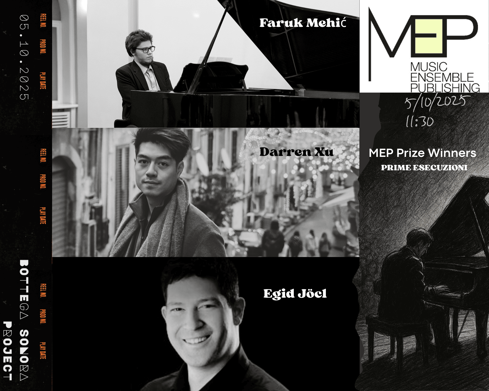 Music Ensemble Publishing è lieta di annunciare i vincitori del premio MEP nell'ambito della seconda edizione di Prime esecuzioni a cura di Bottega Sonora Project, conclusasi a L'Aquila lo scorso 5 ottobre. I tre vincitori - con brani per clarinetto, viola e pianoforte - sono il bosniaco Faruk Mehić, il cino-canadese Darren Xu e l'austriaco Egid Joechl. A loro i nostri complimenti e l'ingresso nella squadra dei compositori MEP, una casa di edizioni musicali sempre più internazionale!